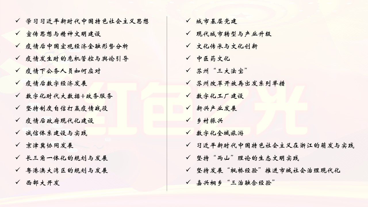 疫情后政府現(xiàn)代化建設(shè),誠信體系建設(shè)與實(shí)踐,京津冀協(xié)同發(fā)展,長三角一體化的規(guī)劃與發(fā)展 粵港澳大灣區(qū)的規(guī)劃與發(fā)展 西部大開發(fā)城市基層黨建,現(xiàn)代城市轉(zhuǎn)型與產(chǎn)業(yè)升級(jí),文化傳承與文化創(chuàng)新