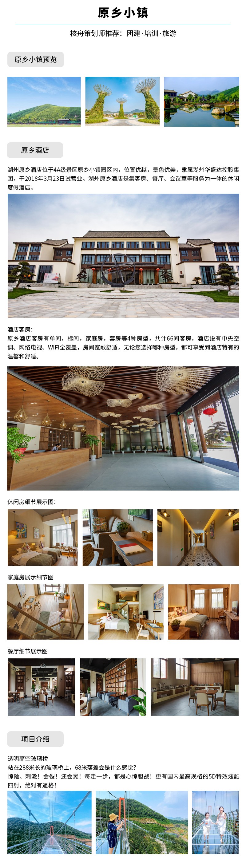 核舟安吉拓展基地-原鄉小鎮地處莫干山脈北麓的湖州吳興妙西的原鄉探險公園,按照“一館兩園五區”布局,建有全亞洲最大,集蝴蝶養殖、觀賞、放飛、科普教育為一體的生態科普館;坐擁千畝梅花觀賞園,沿山勢建有全國最長的原枕木觀光棧道。內設288米長88米落差及酷炫5D特效的玻璃橋、玻璃滑道、彩虹滑草、高標準馬場、軌道長約1500米的童話小火車等項目,是華東首個以運動探險為主題國家級AAAA景區。