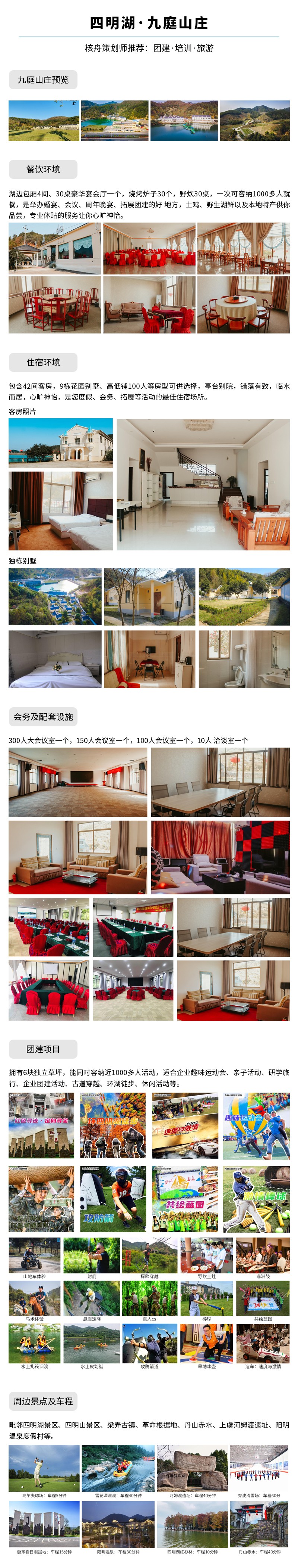 核舟紹興拓展基地-四明湖九庭山莊位于余姚著名浙東抗日根據(jù)地梁弄,四明湖畔,與上虞的交界處,余姚西高速口下,8分鐘即可抵達(dá), 距離杭州80分鐘,距離寧波1小時(shí)左右。這邊依山傍水,環(huán)境清新自然,總面積達(dá)600畝,建筑面積20畝,包含30桌宴會(huì)廳、300人會(huì)議室、150人會(huì)議室、100人會(huì)議室、大小包廂、ktv、棋牌房、42間客房以及9棟花園別墅等。