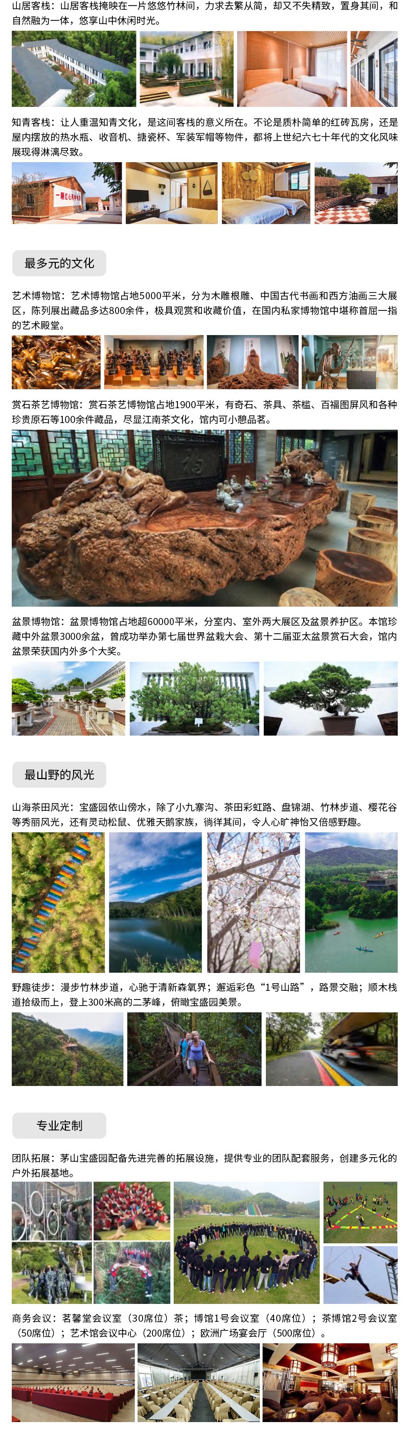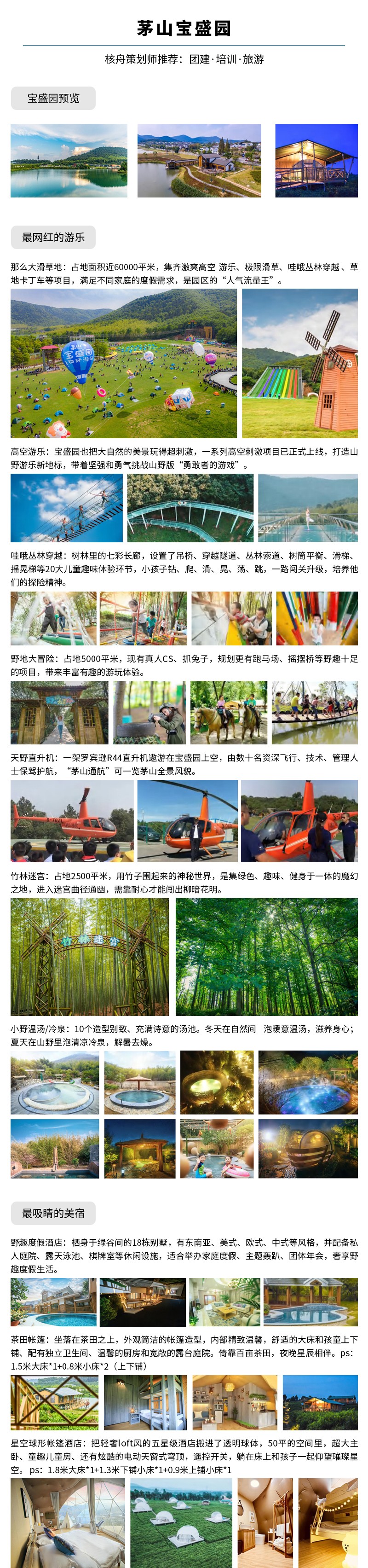 核舟常州團建基地-茅山寶盛園位于風景秀麗的江蘇金壇茅山腳下, 園區(qū)總面積3200畝,總投資15億元人民幣,圍繞 “野趣”主題,打造了極限滑草、網(wǎng)紅秋千、天空 步道、茅山叢林漂流等近四十項山野游樂項目,并 規(guī)劃有自然藝術(shù)、盆景、賞石茶藝、人民防空四大 博物館;野趣度假別墅、星空球形帳篷酒店、茶田 帳篷、山居客棧、知青客棧五大山野美宿;名膳居 山野菜、山野大灶臺、田園燒烤、石鍋飯四大至臻 山野美食。2019年12月小野溫湯/冷泉上線,豐富 了園區(qū)季節(jié)性體驗,整體形成集“美宿度假、山野 游樂、研學團建、網(wǎng)紅打卡”等為一體的山野度假 游玩勝地,被譽為“藏在山野里的度假樂園”。