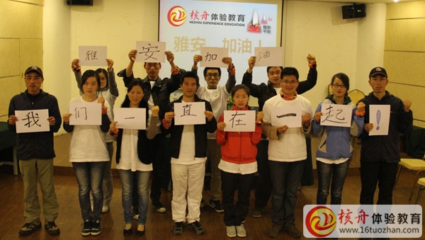 在這兩天體驗式培訓中,大家都很用心,收獲了很多。同時也想把大家兩天來的正能量傳遞給正在雅安抗震救災的同胞們。大家一起與教練喊著口號為雅安加油!