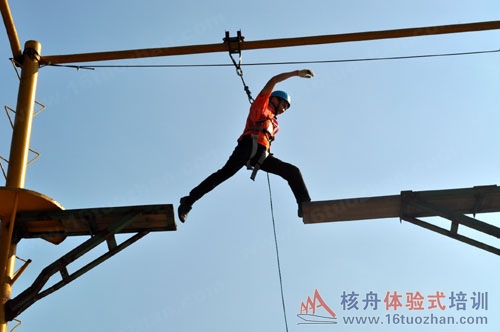 高空挑戰—空中斷橋,隊員要上到8米高的跳臺上,跳躍過斷開的橋面。有些事情,看起來容易,做起來卻很難。但是當下定決心一定要時,其實也不是那么難,超越只是一躍之遙。