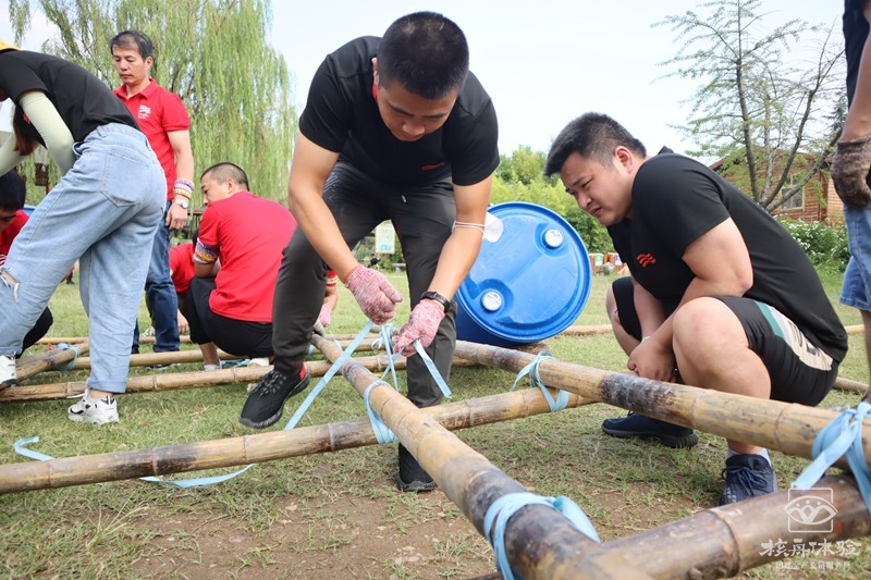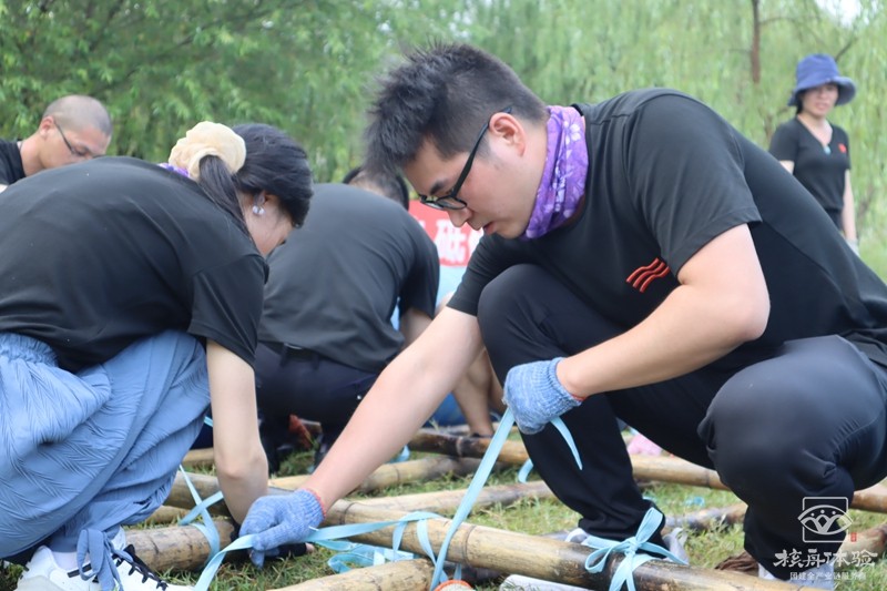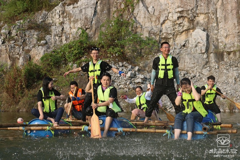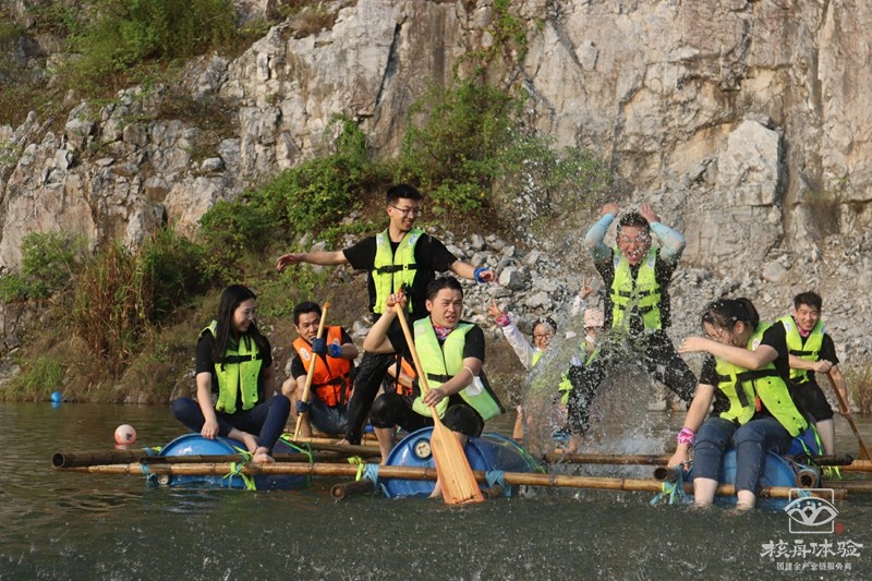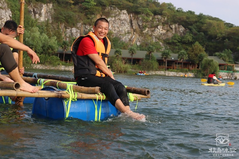 在青山綠水之間,在充滿陽(yáng)光氣息的青草地上和樹蔭下,團(tuán)隊(duì)成員一起討論方案一起動(dòng)手,扎好一只漂亮的竹筏,舉行隆重的下水儀式。