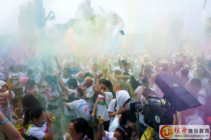 一聲令下,所有人都在同一時間拋灑著彩色粉末,頓時天空都被染成了彩虹色,彩色粉末從頭拋撒到腳,在這里沒有狼狽,只有不羈的酷炫,沒有冷漠,只有陌生人之間最燦爛的笑容。