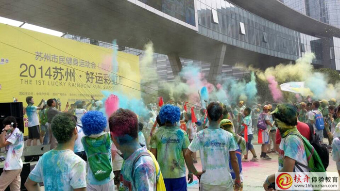 蘇州首屆好運彩虹跑今天上午10點在獨墅湖月亮灣廣場開跑,8點不到人們就陸續來到現場做好準備工作,大家互相在好友身上留下彩色印記,還有許多人正在用手機、相機互相留下美好的瞬間。