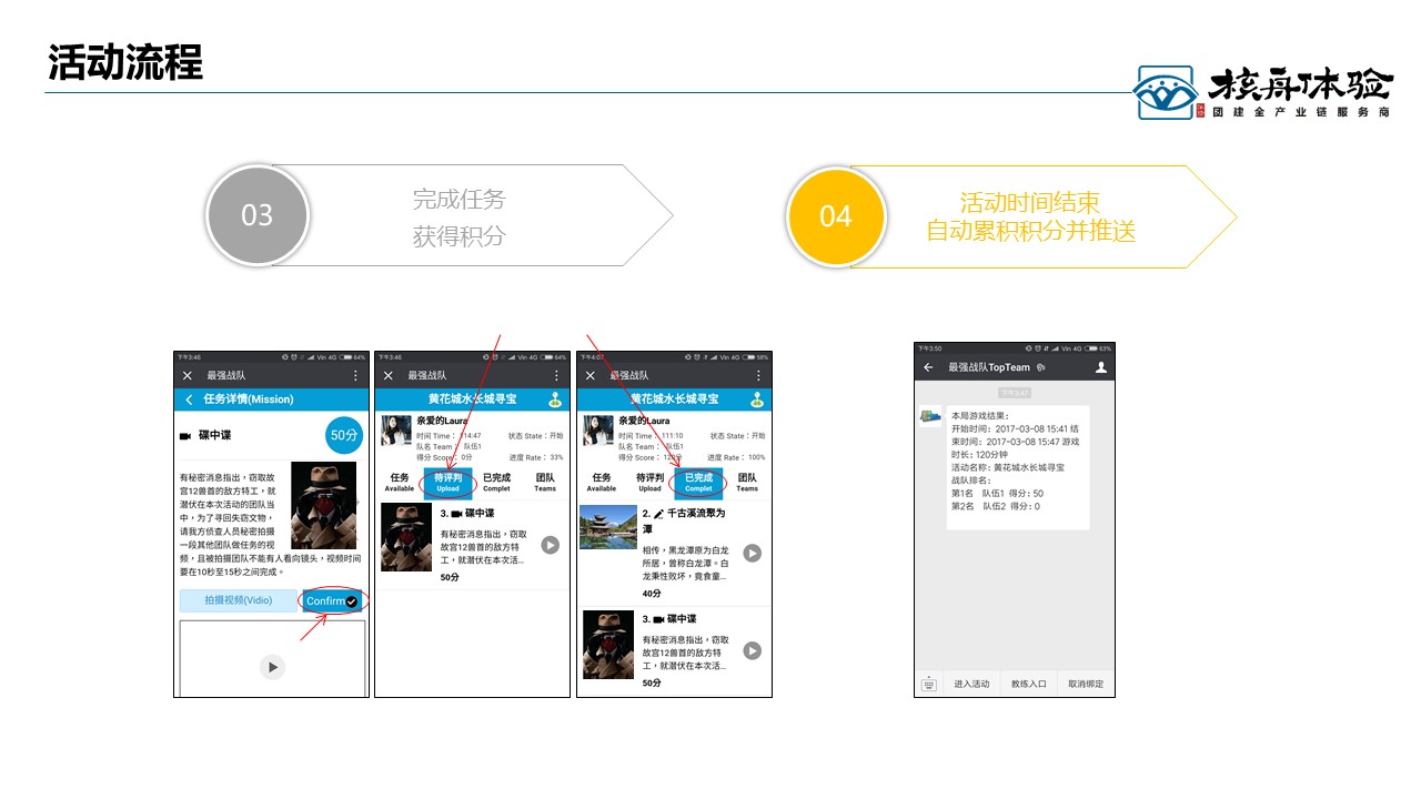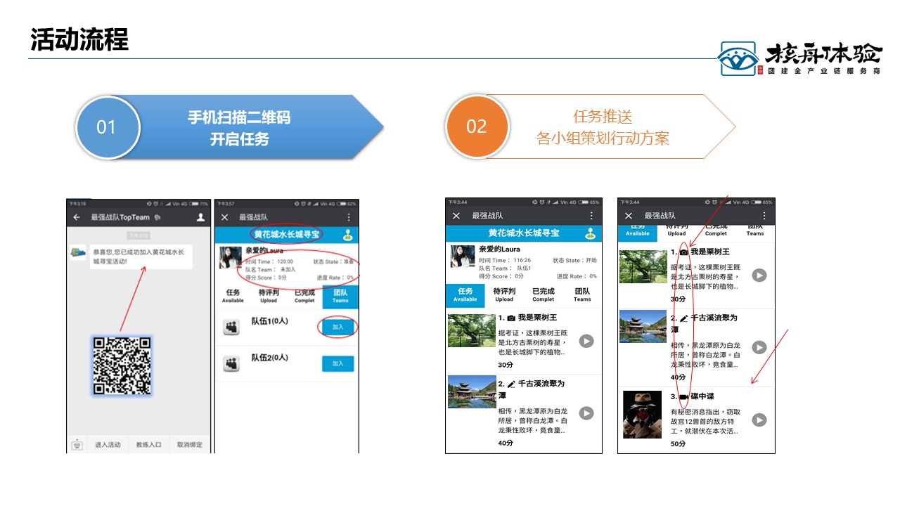 最強(qiáng)戰(zhàn)隊(duì),跑男升級(jí)版, 線上線下結(jié)合, 時(shí)尚有趣有料。活動(dòng)場(chǎng)景設(shè)置簡(jiǎn)單易用 、方便教練管理活動(dòng)現(xiàn)場(chǎng),而且瞬間引爆活動(dòng)現(xiàn)場(chǎng)氣氛 、同時(shí)自助留下精彩影像。核心玩法:小程序基于景區(qū)元素+企業(yè)文化+游戲任務(wù)多元融合設(shè)計(jì),體驗(yàn)中更加強(qiáng)調(diào)以學(xué)員為中心的決策與執(zhí)行